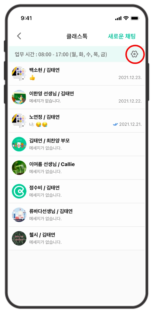 클래스톡(1:1 채팅) 목록 상단 업무 시간란에서 설정 (톱니바퀴) 아이콘을 누르면 업무 요일 및 시간을 자유롭게 변경할 수 있어요.