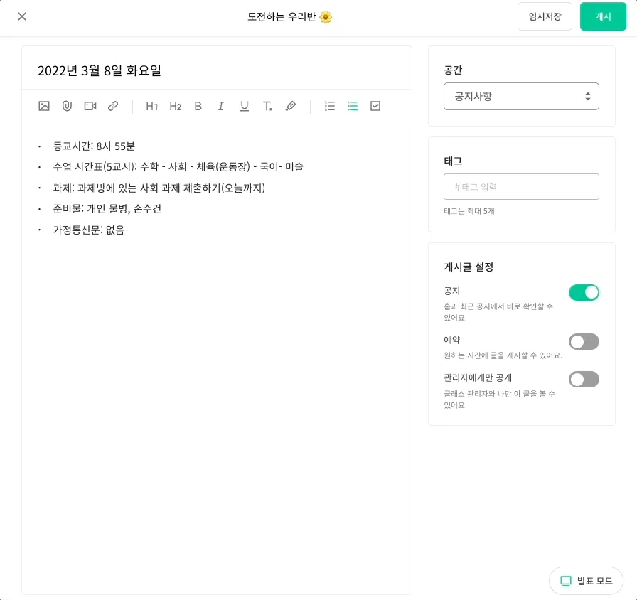 어떻게 발표(칠판) 모드로 보여줄 수 있나요?