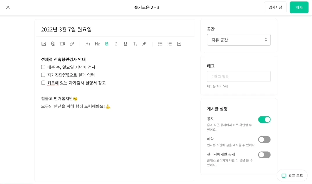 간단해요. 글 작성 시(PC) 우측 하단의 [발표 모드]를 클릭하세요.