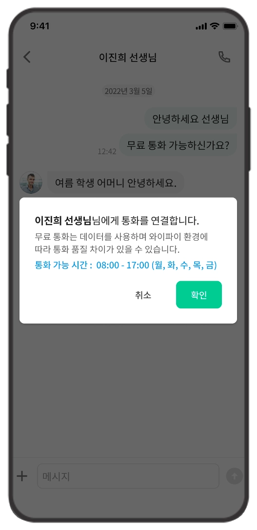 통화 아이콘을 누르면 위와 같이 확인한 후 통화를 연결합니다. 통화 가능 시간은 선생님의 통화 가능 시간을 의미합니다.