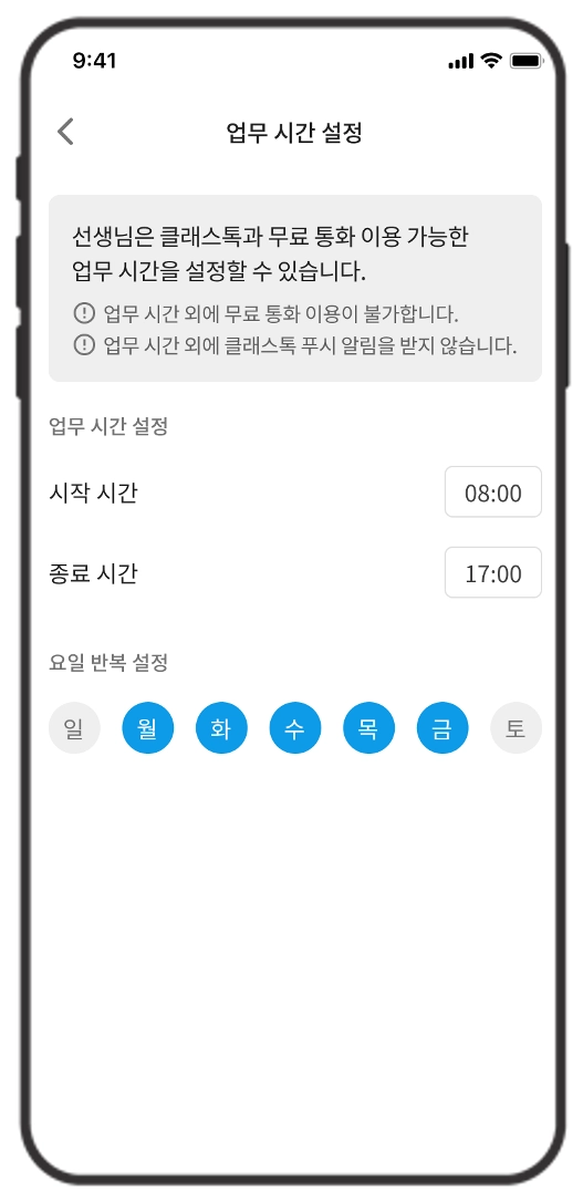업무 요일과 시간을 설정해주세요. 지정한 업무 시간 외에는 전화 및 클래스톡 알림이 오지 않습니다.