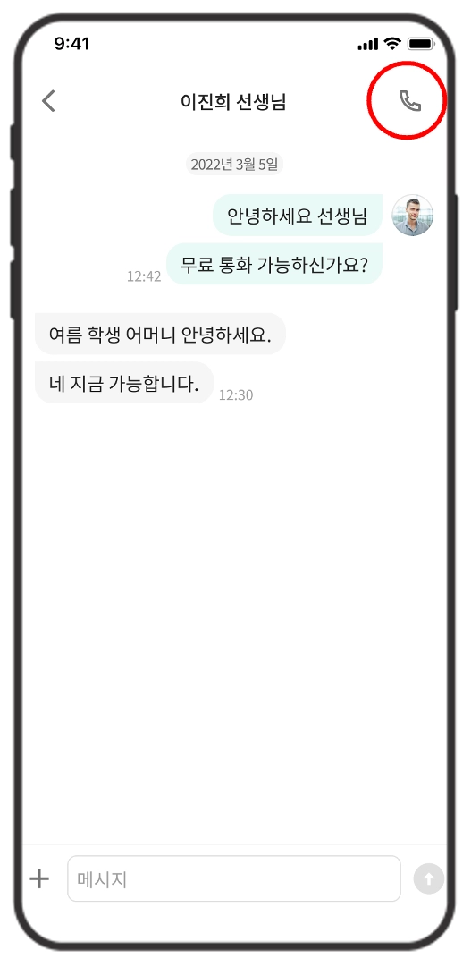클래스톡(1:1 채팅) 화면에서 우측 상단의 수화기 아이콘을 누르면 상대방과 통화가 가능합니다.