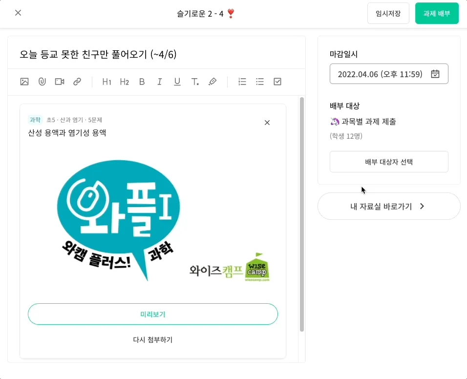 또 과제 수정을 통해 과제를 배부할 구성원을 추가할 수도 있어요!
