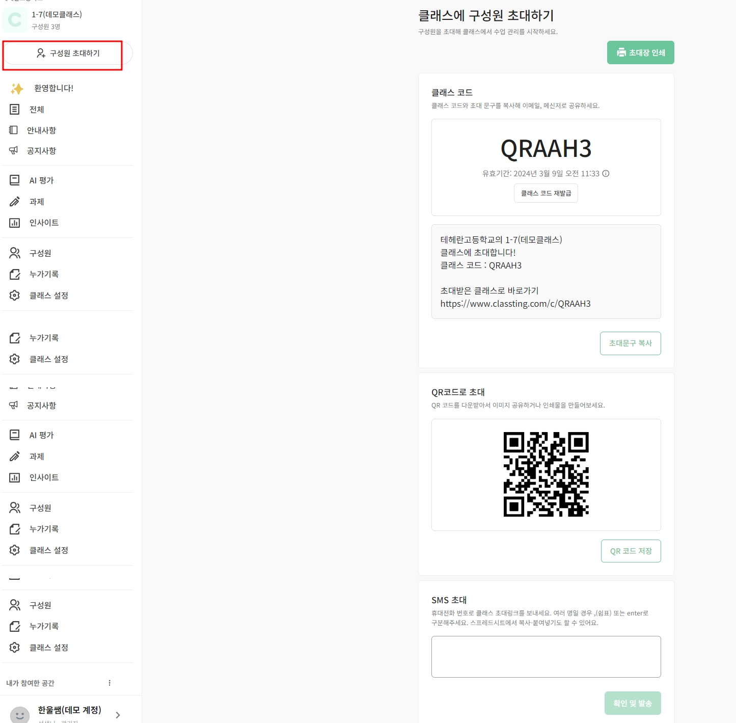 클래스 코드, 문자, QR코드로 구성원을 초대할 수 있습니다.