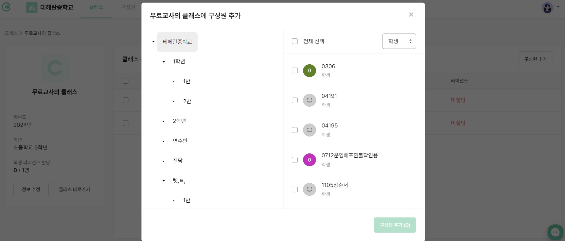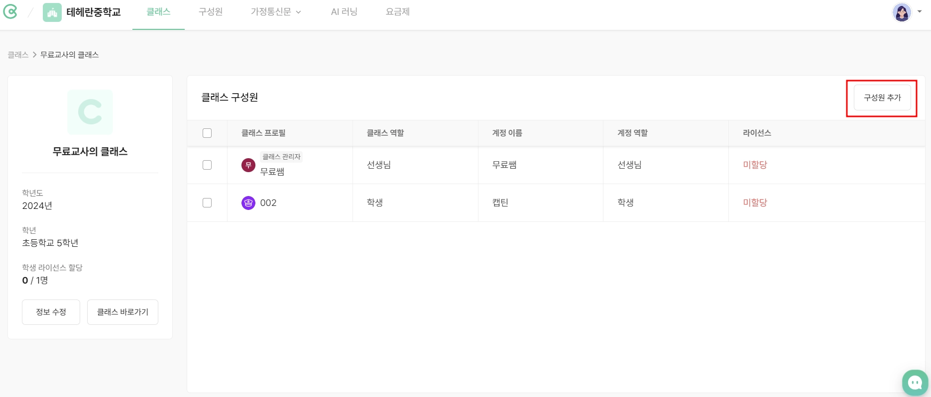 기관 페이지 - 클래스 - 해당 클래스 - 구성원 추가를 통해 최고 관리자가 클래스를 관리할 선생님과 학생 계정을 직접 추가할 수 있습니다.