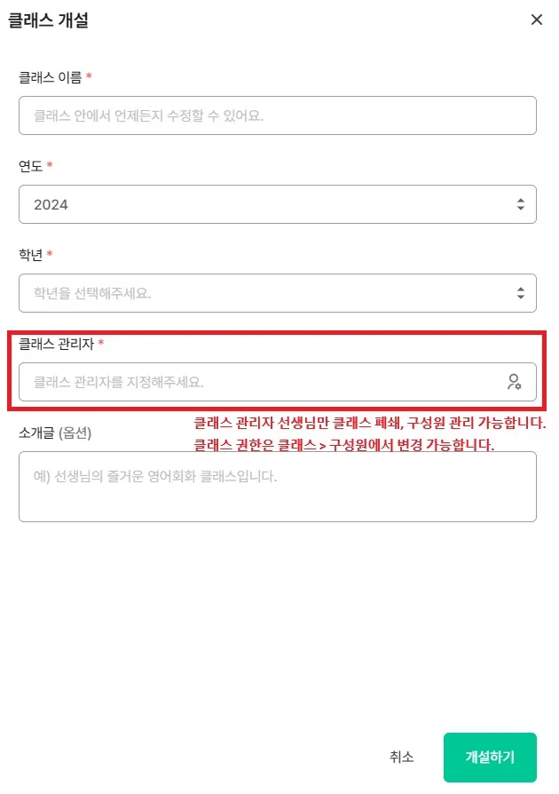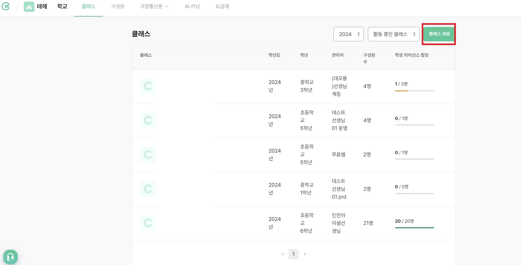최고 관리자는 기관 페이지에서 클래스를 개설할 수 있습니다.