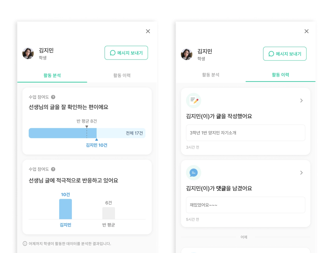 학생의 클래스 활동을 확인할 수 있는 활동 분석 탭(왼쪽)과 활동 이력 탭(오른쪽)이에요.