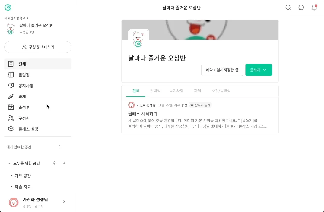 이제 클래스에 고정 항목으로 [알림장]이 생겨요. 공지사항과는 구분되는 알림장을 적으시도록 구분한 메뉴랍니다!