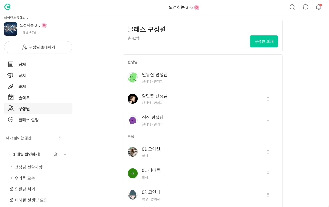 구성원 목록에서 개별 학생 이름을 클릭하면, 학생별로 클래스 활동을 분석한 리포트를 볼 수 있어요. (PC)