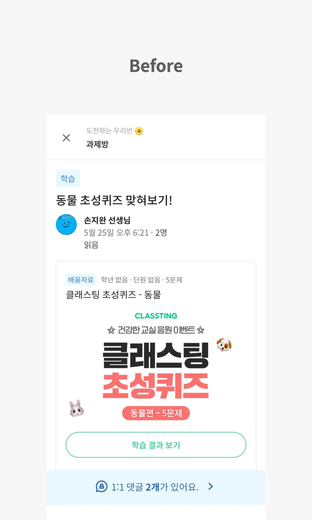 특정 글을 읽다가도 이제는 해당 글이 포함된 클래스 내 공간(예. 과제 공간)으로 이동할 수 있어요. 한 공간에 있는 여러 게시물을 확인할 때나, 지금 읽고 있는 글이 어떤 공간에 있는지 바로 확인하고 싶을 때 도움이 될 거예요.