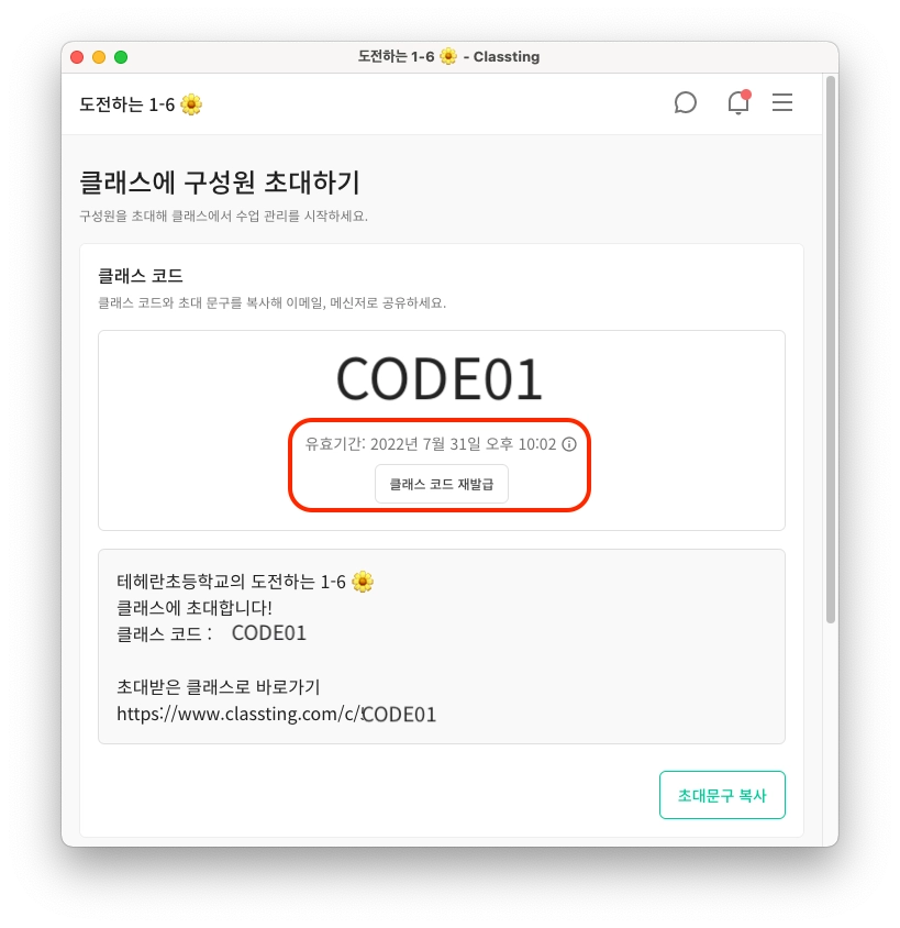 구성원에게 클래스 코드를 전달하기 전, 남은 유효 기간이 충분하지 않다면 직접 클래스 코드를 재발급 받아 전달해주세요.