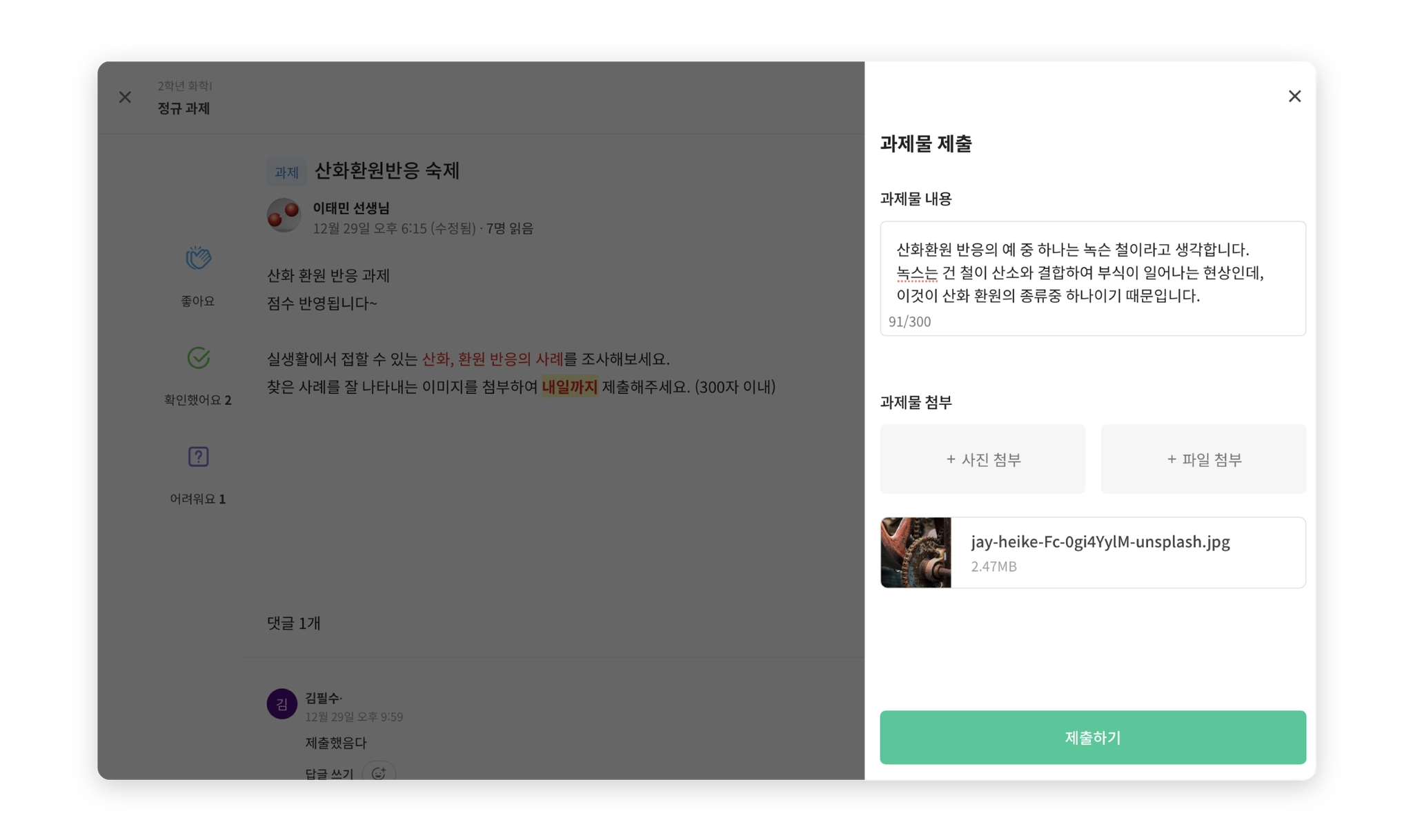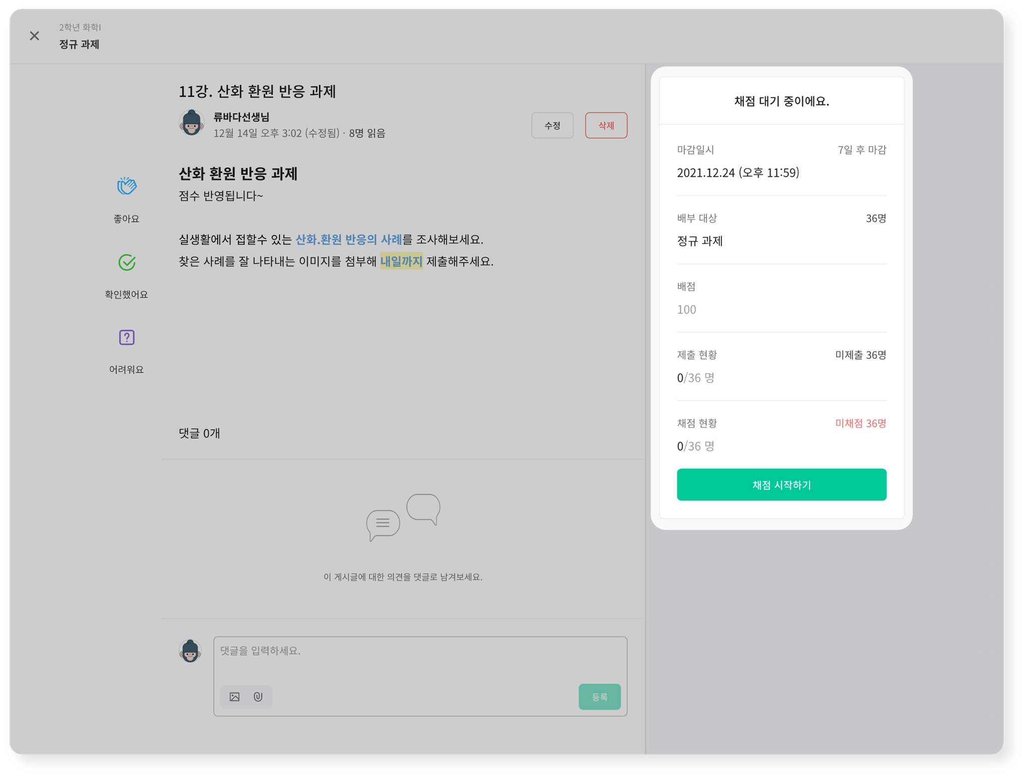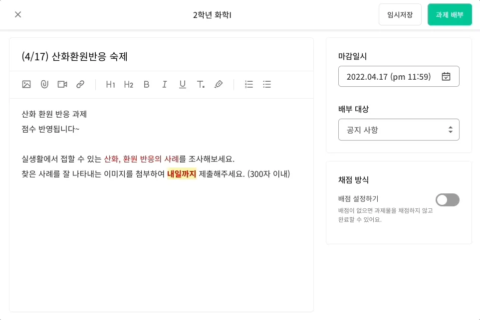 과제 게시글을 클릭하면 구성원은 과제 제출을, 관리자인 선생님은 채점을 시작할 수 있어요.