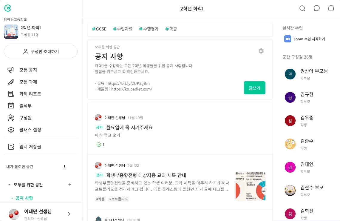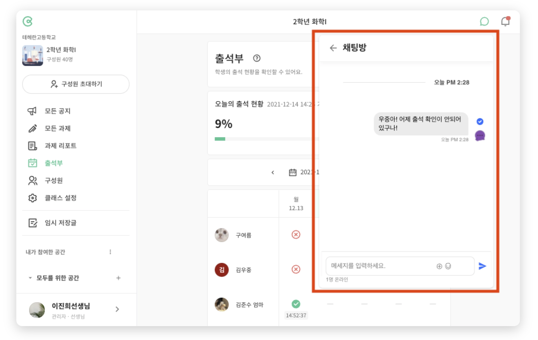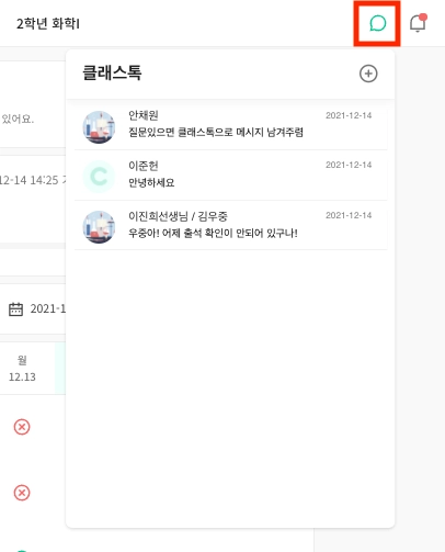 클래스 메뉴에서 | 좌측 [구성원] 메뉴를 클릭하여 대화할 구성원을 클릭하세요.