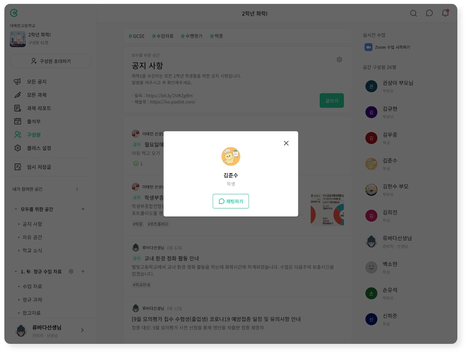 또 하나의 굿뉴스! 이제 클래스 내에서 구성원에게 바로 1:1 대화를 걸 수 있어요.