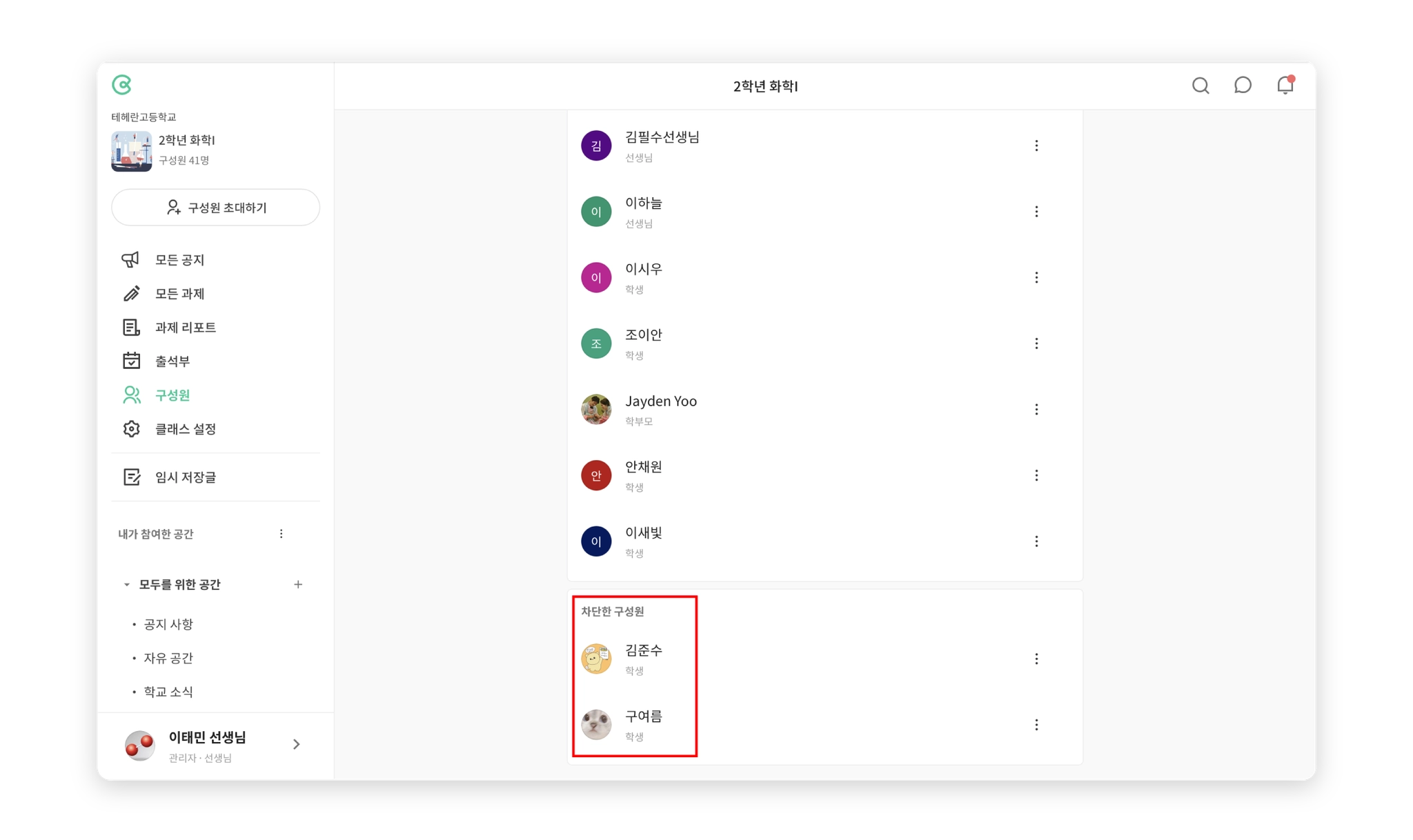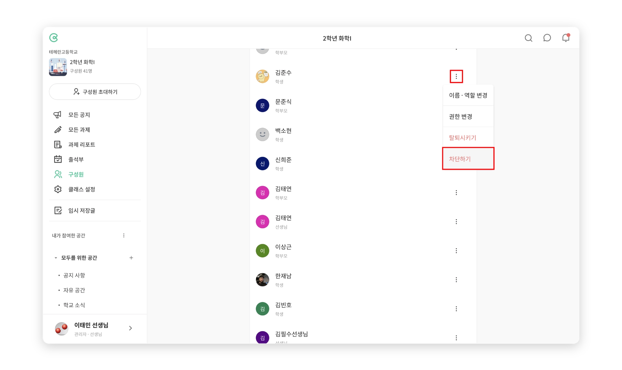 차단된 구성원은 같은 계정으로 동일한 클래스에 접근하거나 활동할 수 없어요.