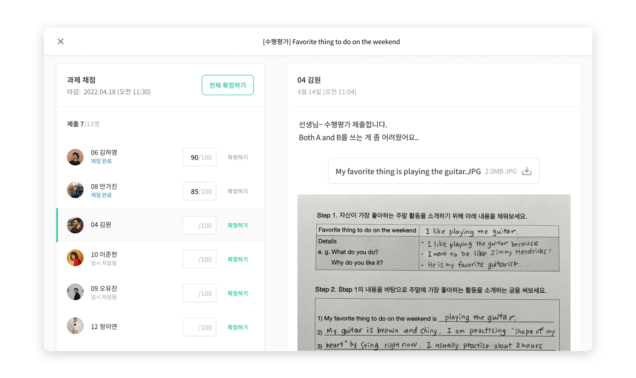 채점을 시작해볼까요? 왼쪽 구역에는 구성원 목록이 보이고 오른쪽에는 해당 구성원의 과제물이 보입니다. 여기서 선생님은 과제를 보고 바로 점수를 입력하고 [확정하기]를 누른 후, 같은 화면에서 바로 다음 학생 과제보기로 넘어갈 수 있어요. 전체 과제 채점을 완료하고자 하실 땐 [전체 확정하기]를 누르면 됩니다.