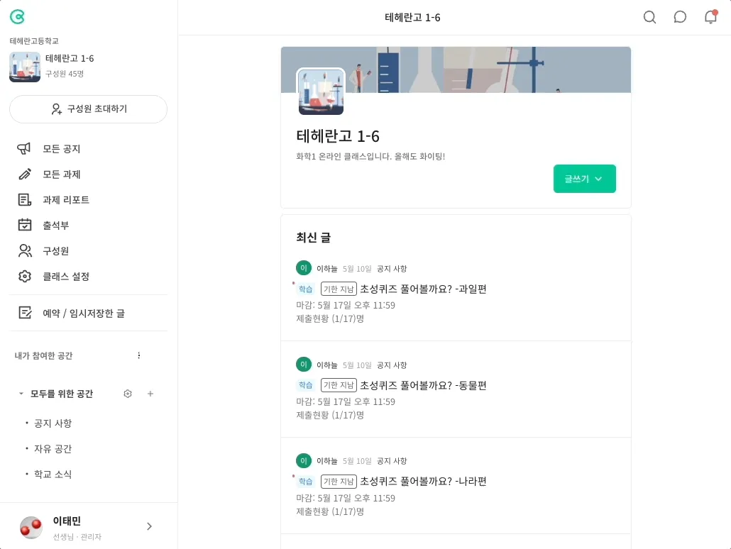 클래스 접속 시 보이는 첫 화면에는 모든 ‘공개’ 공간의 글이 나열되어 있는데요.