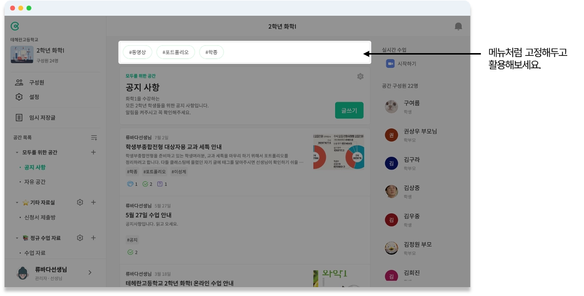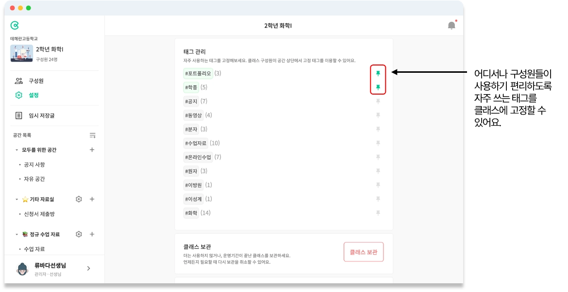 3. 고정된 태그는 클래스 상단에 항상 고정됩니다.