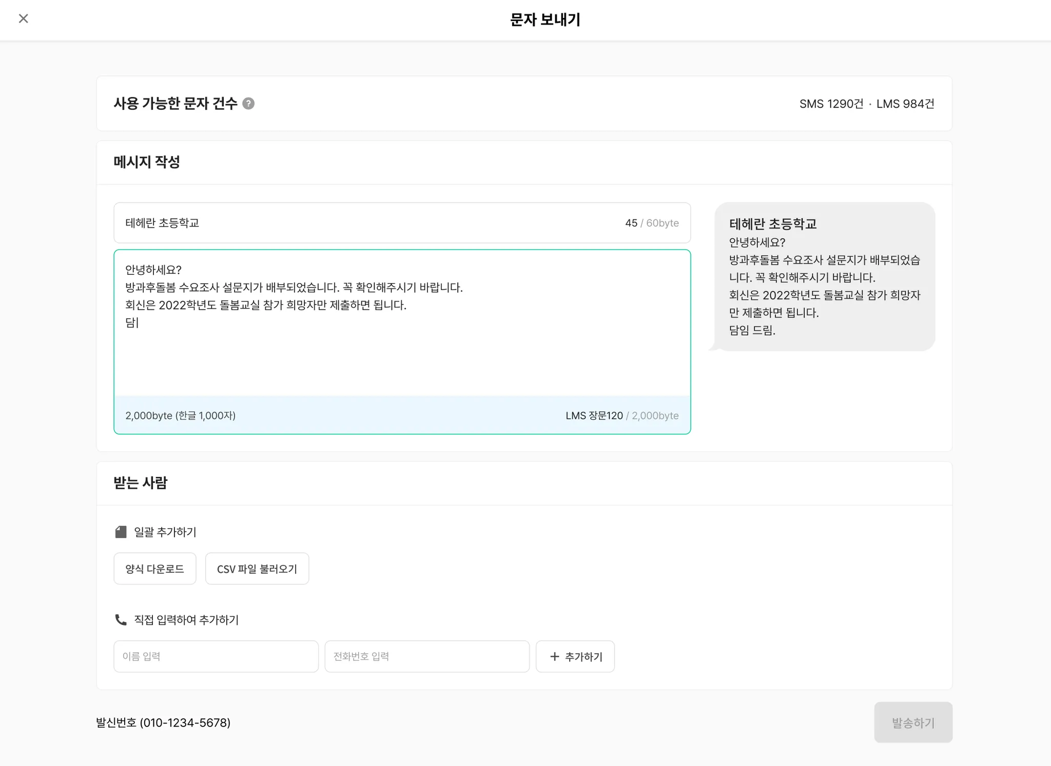 문자 내용이 어떻게 전달되는지, 작성과 동시에 미리보기로 확인할 수 있어요.