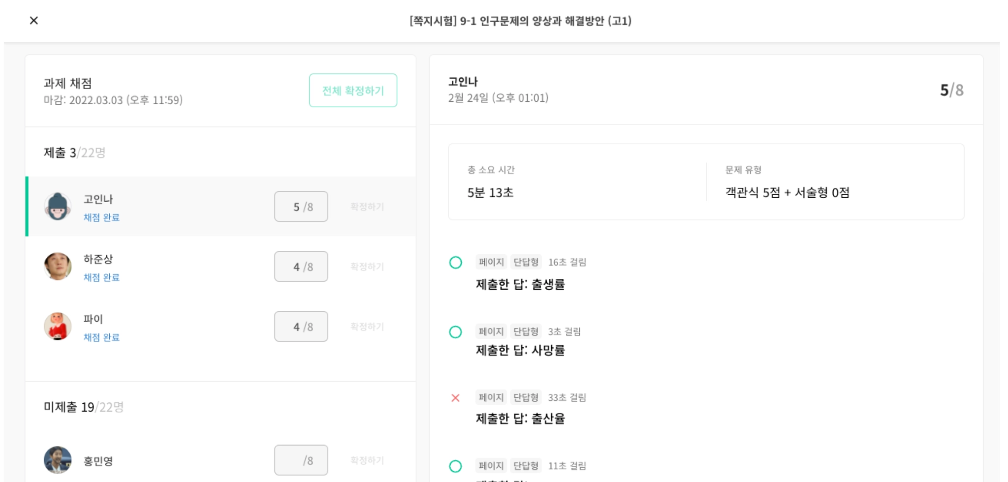 객관식, 단답형은 자동 채점되며, 서술형 문항은 직접 채점하실 수 있습니다.