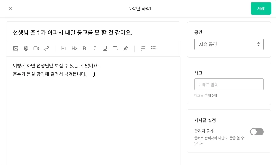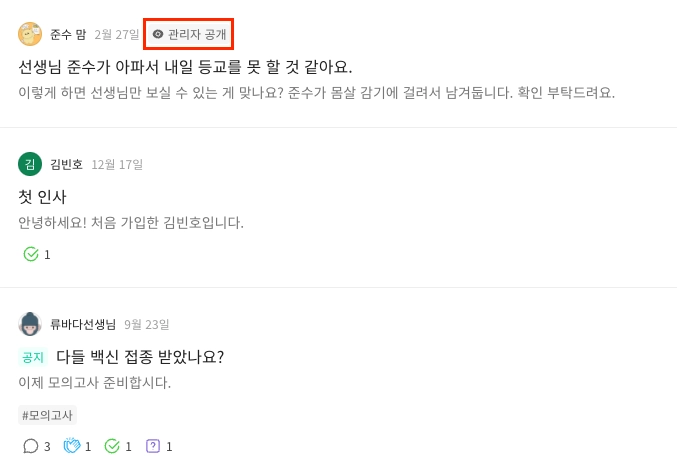 클래스를 개설하신 선생님은 관리자로 자동 설정되어 있습니다. 따라서 구성원(학생/학부모)이 관리자 공개 글을 작성하면 관리자인 선생님만 해당 게시글을 보실 수 있어요.