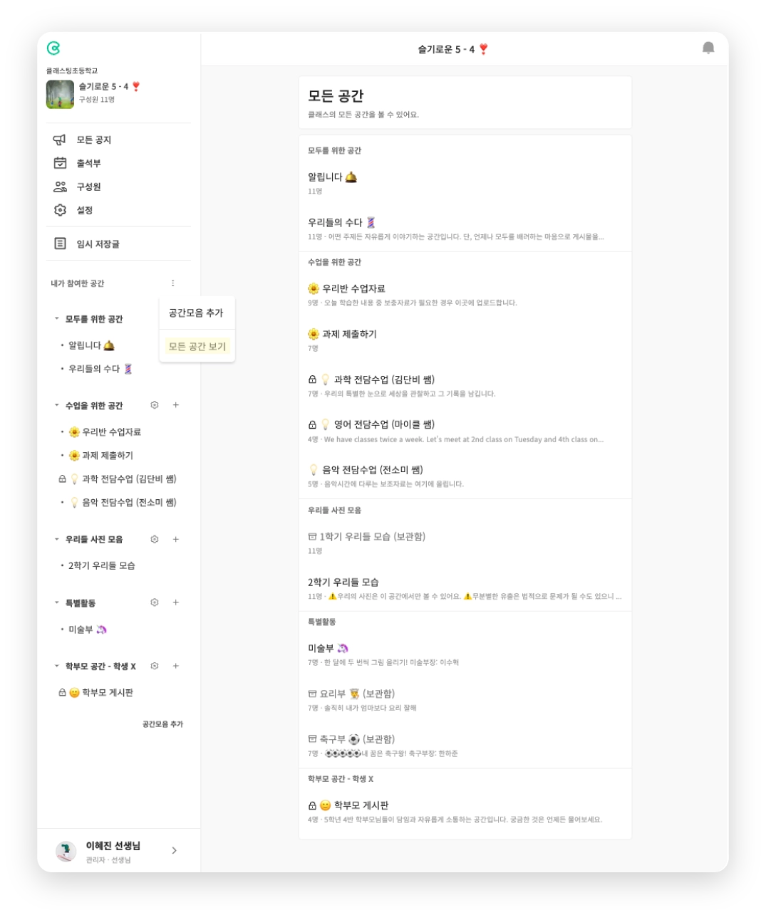 한 클래스의 선생님이 [모든 공간 보기]를 눌렀을 때 모습이에요. 공간 목록과 달리 보관된 공간들도 보이네요!