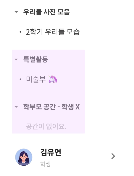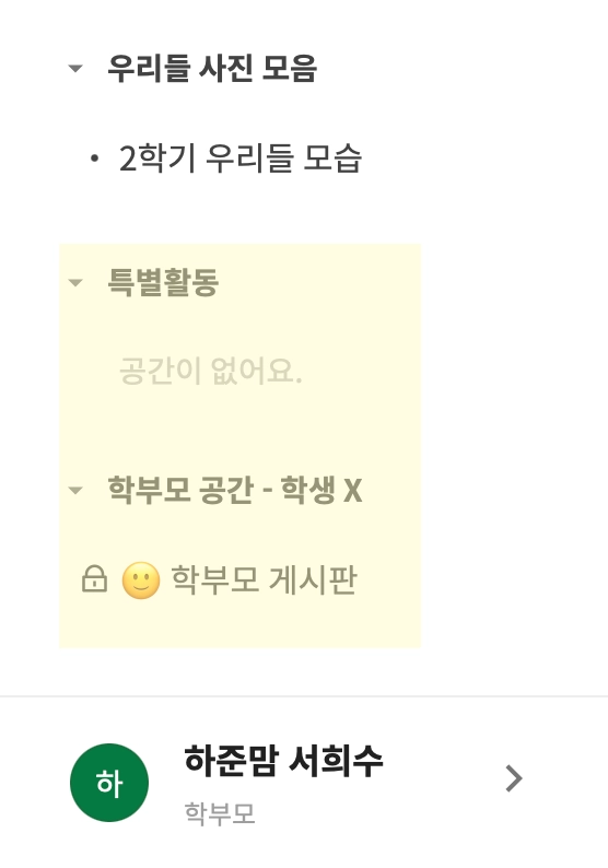 반대로 학부모의 경우 특별활동의 공간에 소속되지 않아 공간이 보이지 않고, 비공개 학부모 게시판은 볼 수 있어요.