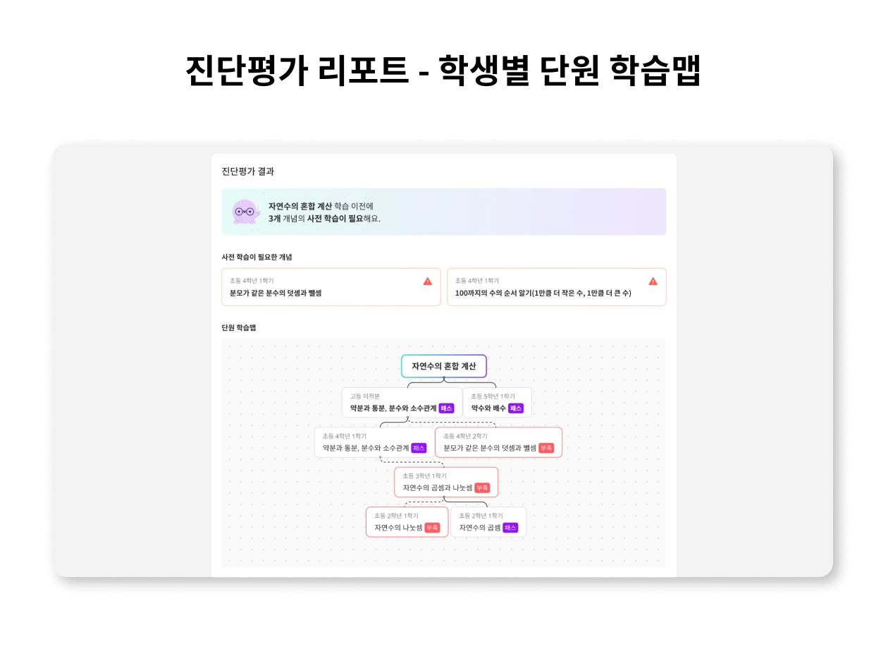 "예를 들어, (리포트상) 구성원의 39%에게 특정 단원 사전학습이 필요하다는 결과를 보면, 해당 단원에 대한 복습이나 동영상 강의 시청과 같은 과제를 단원 학습 중에 추가하여 학습 결손 예방에 도움을 얻을 수 있습니다."