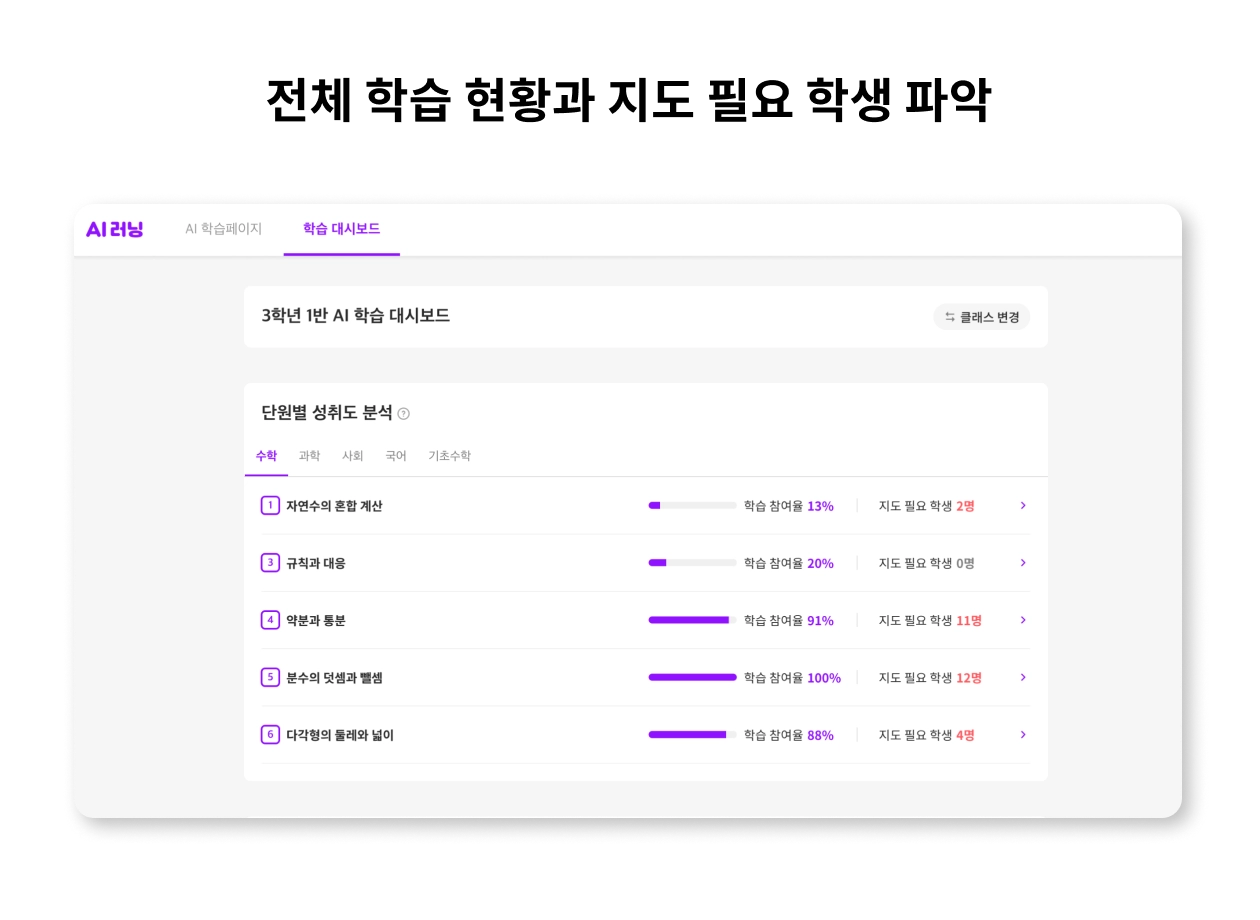 단원별로 우리 반 학습 참여율과 학습 상태, 취약한 학습 요소를 파악할 수 있어요.