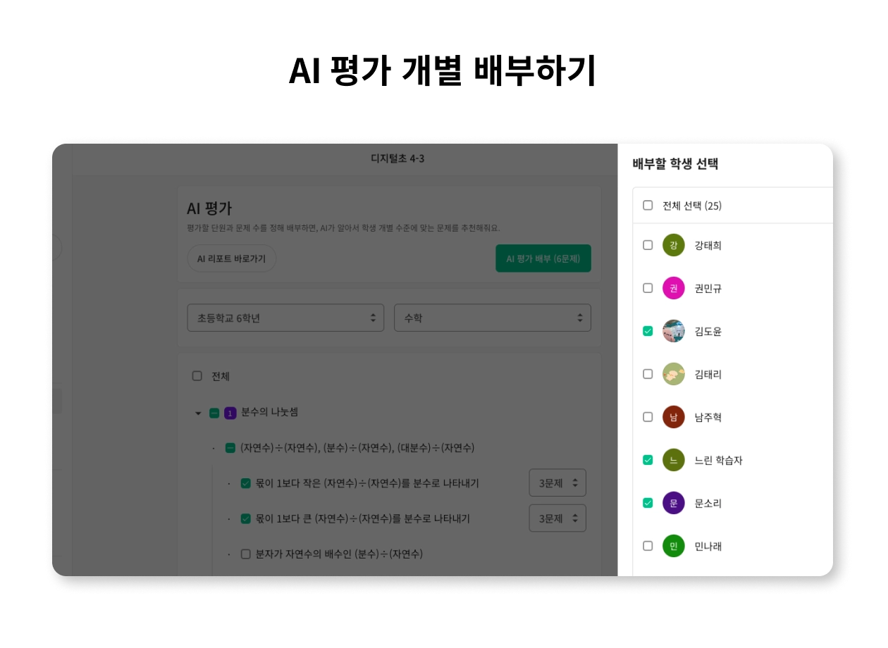 개별 맞춤형 형성평가로 많은 선생님들에게 사랑을 받아온 AI 평가, 이제 개별 맞춤 학습에 더 걸맞게, 배부할 학생을 선택할 수 있게 됐어요. 배부 방법은 기존과 동일합니다.