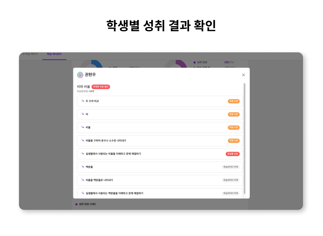 우리 반 리포트에서 특정 학생을 클릭하면, 해당 학생의 학습 진행 및 성취 수준도 세부적으로 확인할 수 있어요.