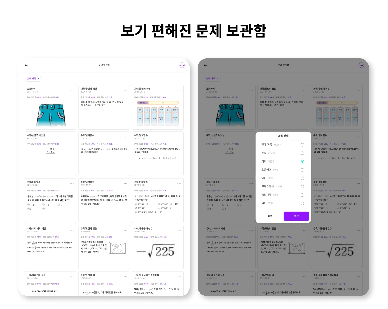 문제 보관함(예. 오답 보관함)에서 좌측 상단 [전체 과목 >]을 누르면 원하는 과목만 필터링할 수 있어요.