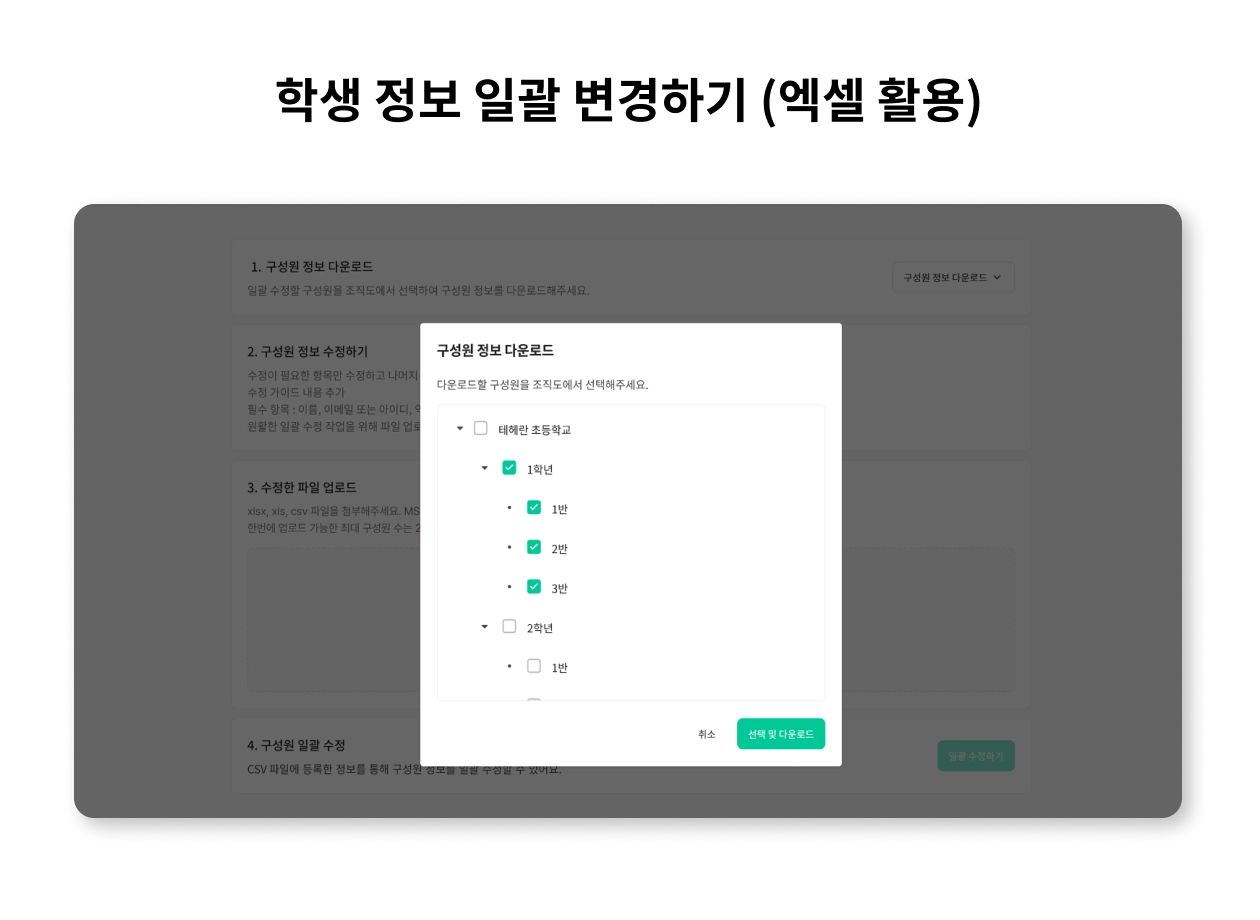 기관의 최고 관리자는 모든 구성원의 정보를 일괄적으로 변경할 수 있어요. 이 정보에는 이름, 아이디, 이메일, 비밀번호, 비밀번호 재설정, 역할, 학년, 조직 단위, 그리고 고유번호가 포함됩니다.