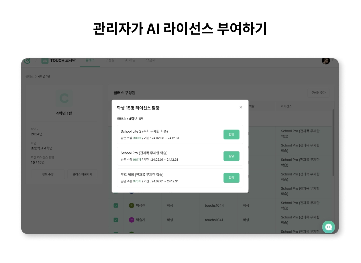 기관의 최고・일반 관리자는 기관 관리 페이지를 통해 바로 라이선스를 확인하고, 구매한 AI 러닝 이용권을 선택하여 학생에게 직접 라이선스를 부여하거나 회수할 수 있어요.