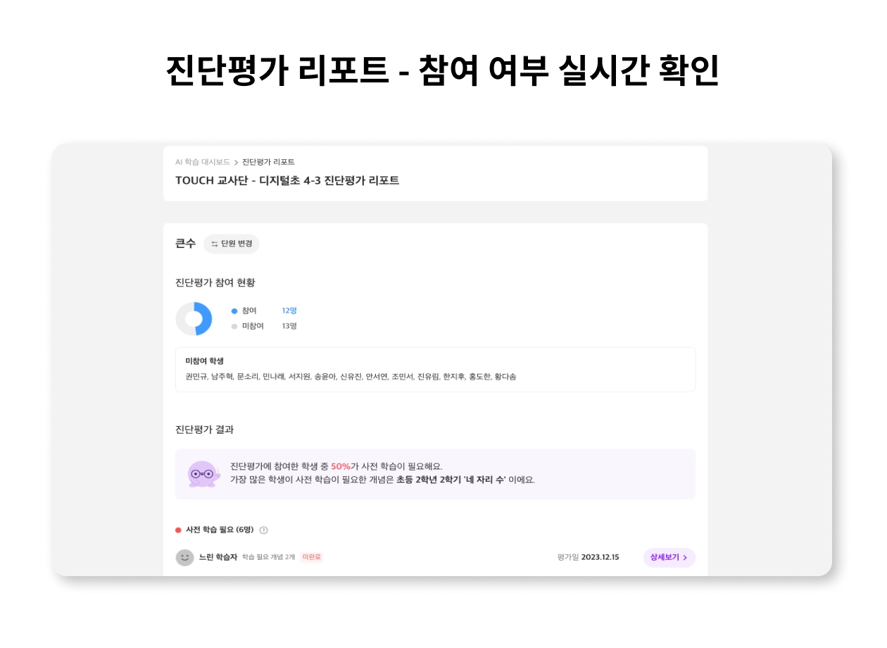 이제 선생님용 진단평가 리포트를 통해 진단평가 참여/미참여 학생을 확인할 수 있습니다. 또한 클래스팅의 AI 러닝 학습 맵에 따른 사전 학습 결손 단원을 학생별로 파악할 수 있어요.