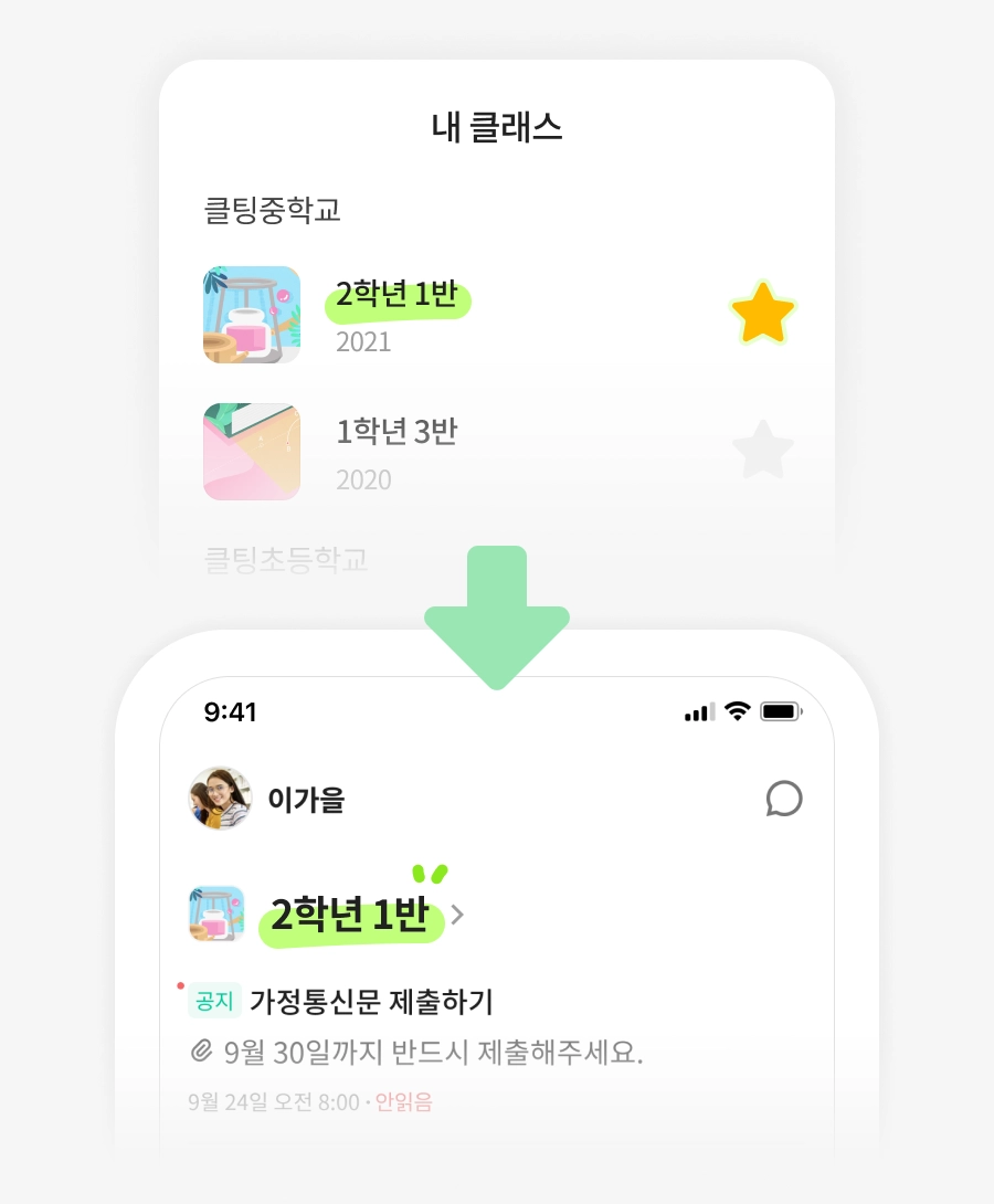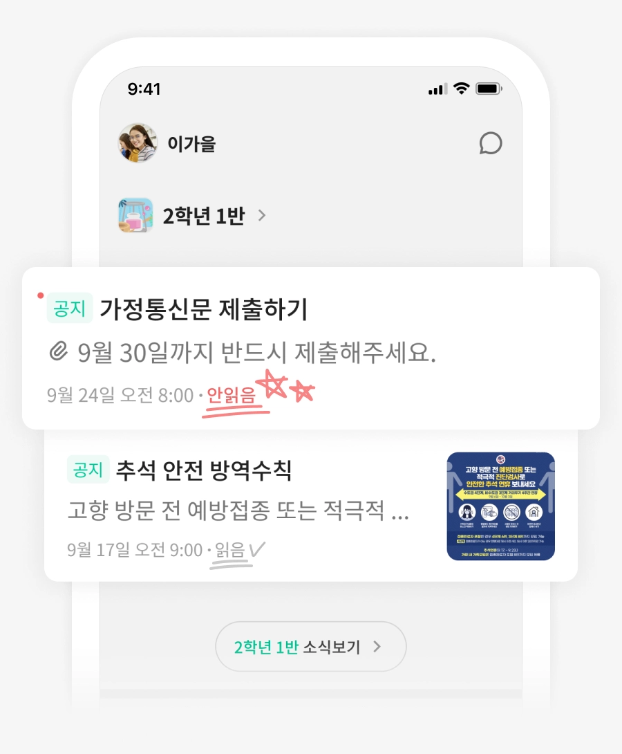 내 클래스의 [공지] 글을 홈 화면에서 제일 먼저 확인할 수 있어요. 가장 최근 공지부터 정렬돼요.