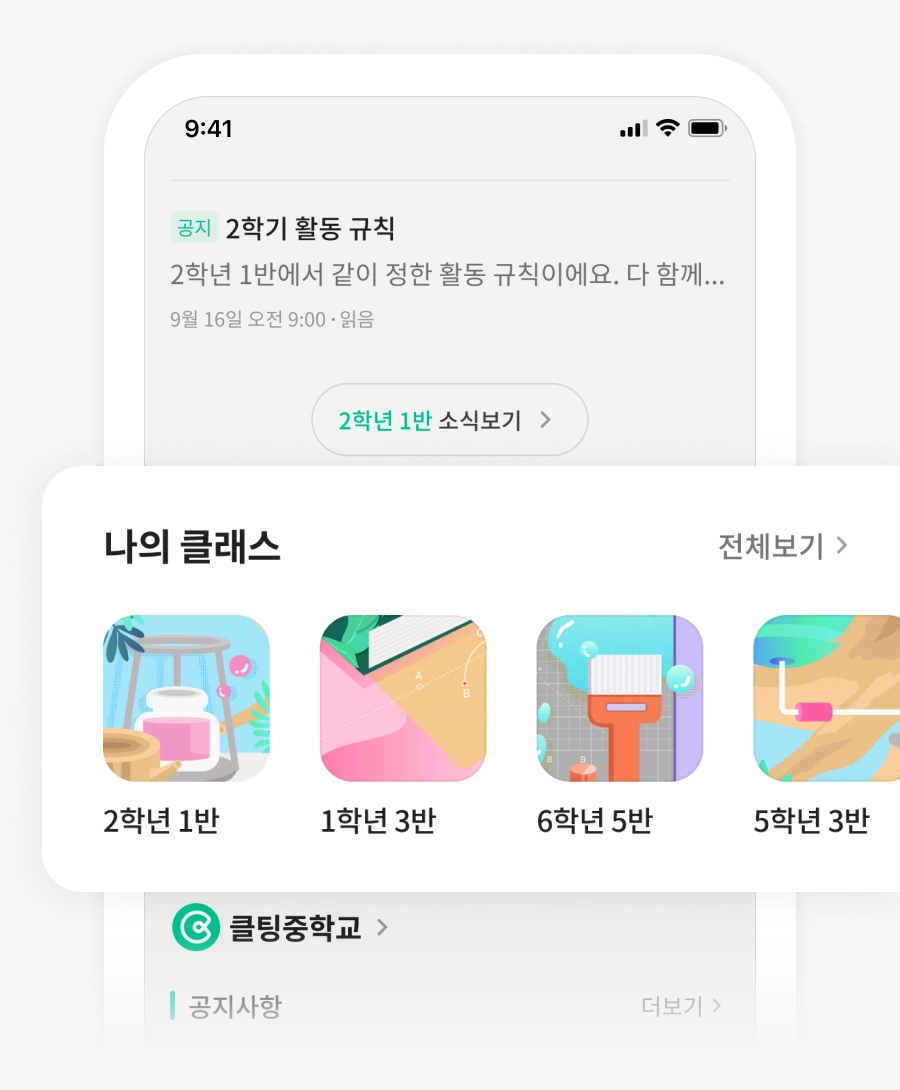 그동안 다양한 정보를 확인하기 위해 이 탭 저 탭 돌아다녀야 해서 번거로우셨죠? 이제 홈 화면에서 클래스 공지, 나의 클래스, 학교 소식 등 꼭 필요한 정보들을 한눈에 볼 수 있어요.